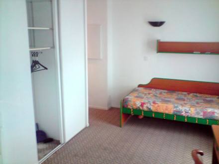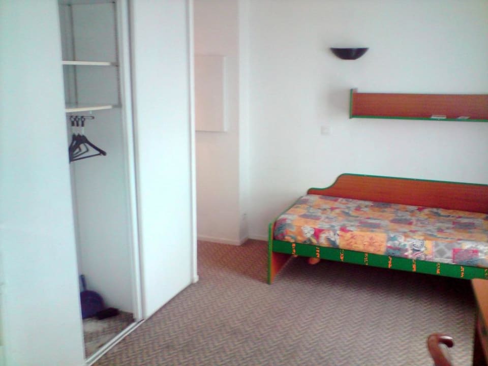 Link: Einbauschrank, Mitte: Bett, rechts vorn: Schreibtisch mit TV