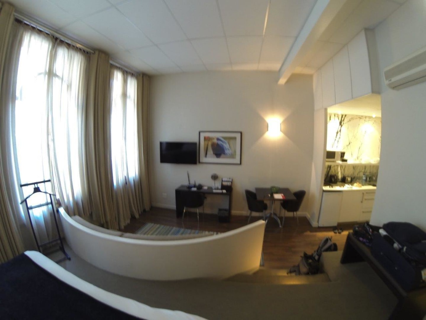Blick vom Bett zum TV/Couch/Miniküche