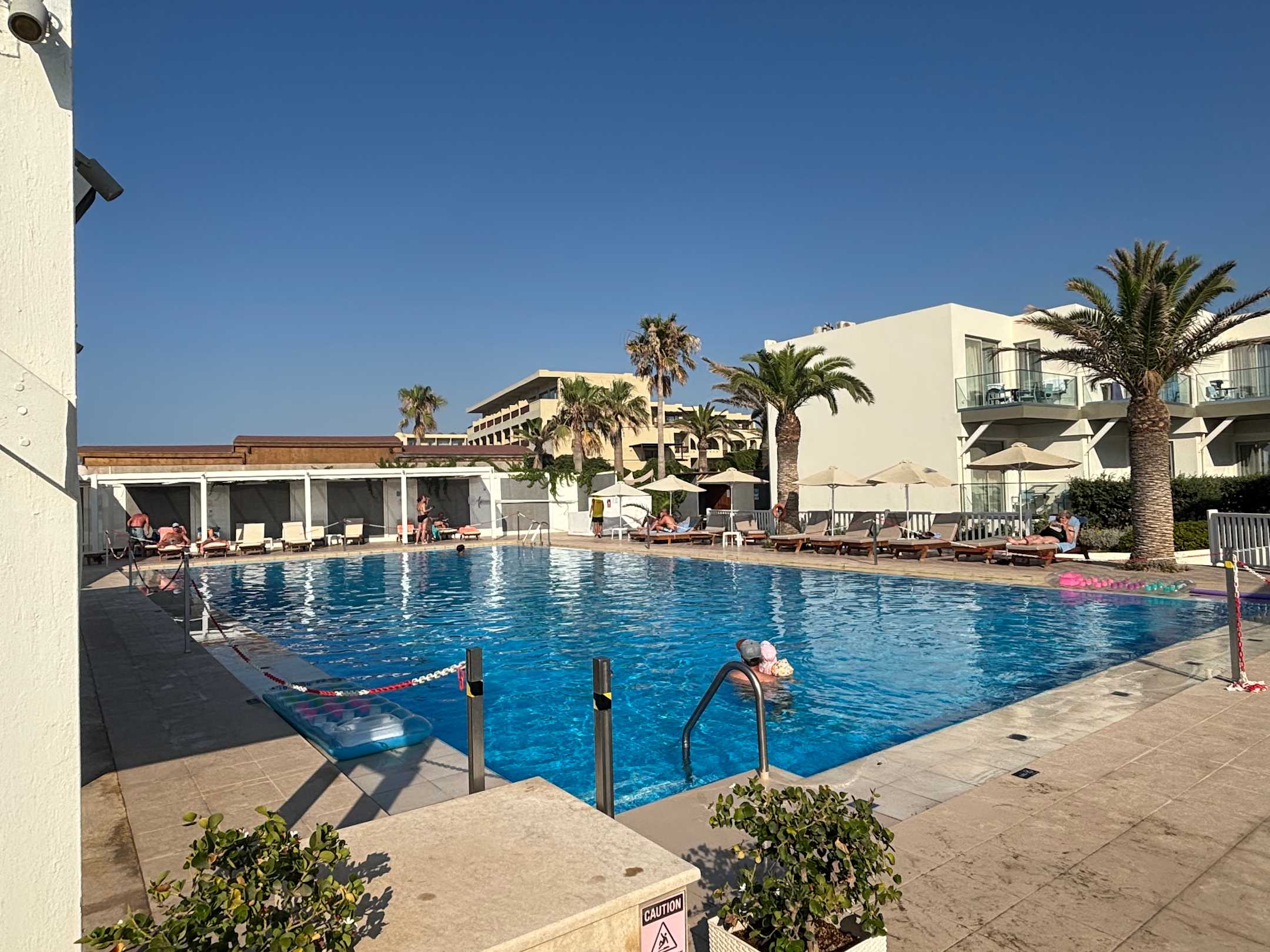 Poolbereich mit Sonnenliegen.