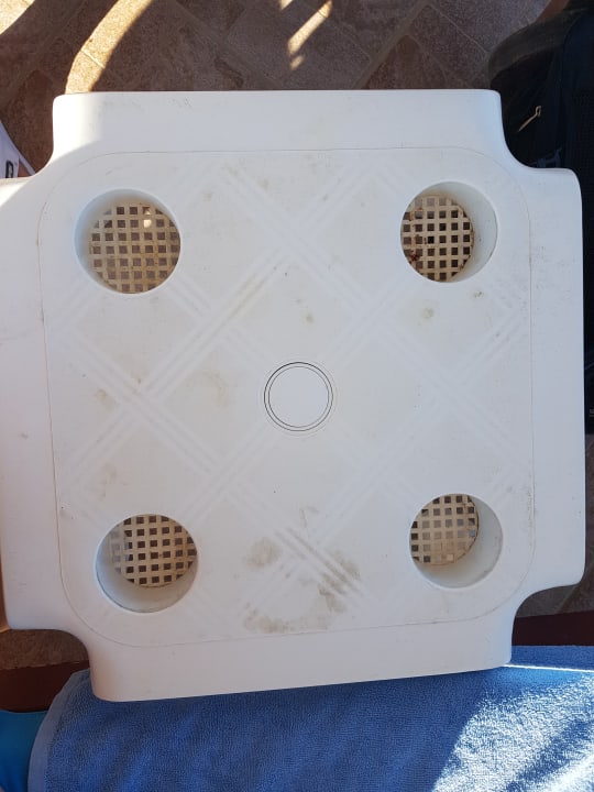 Dreckverkrustete Tische am Pool