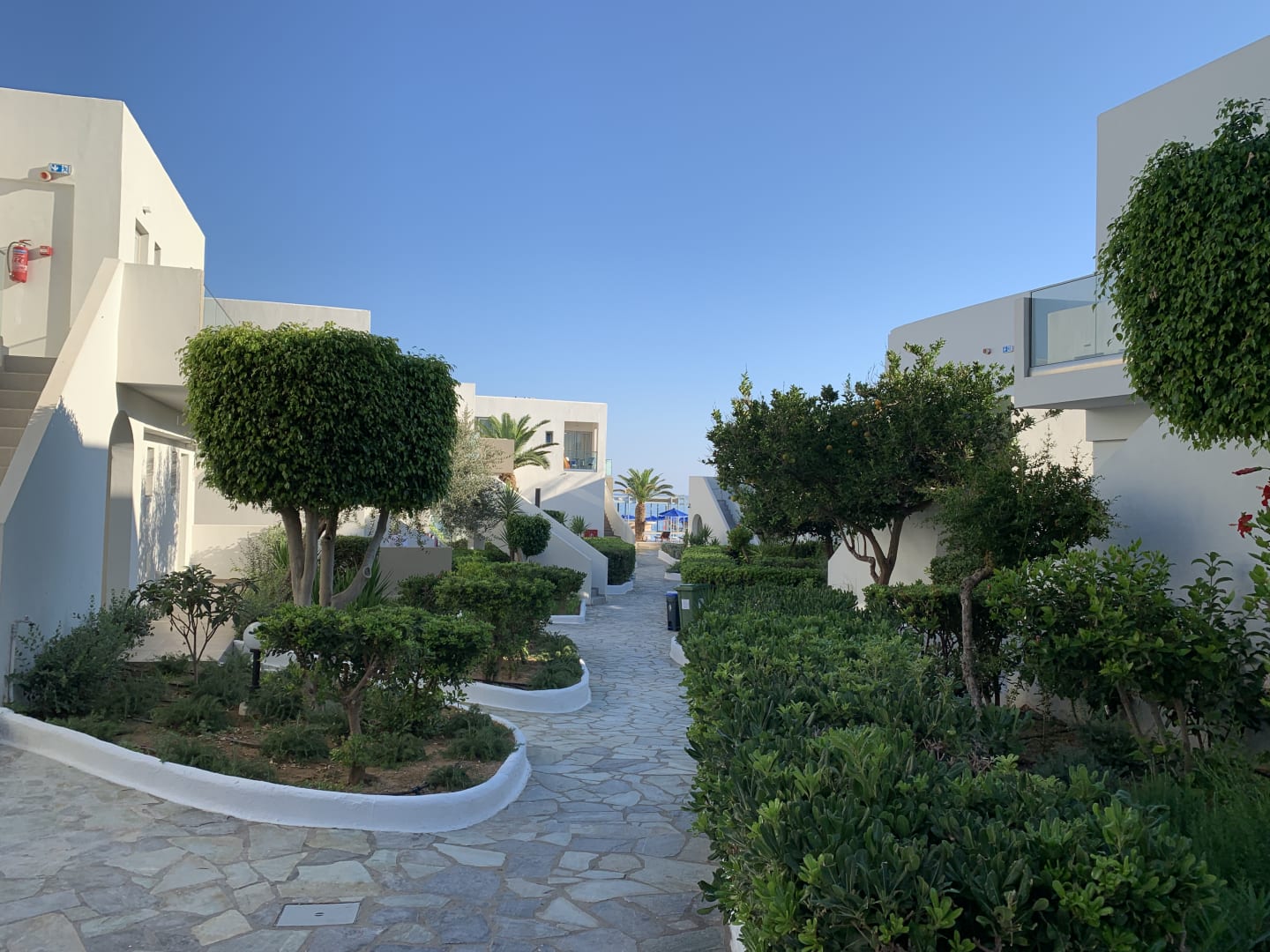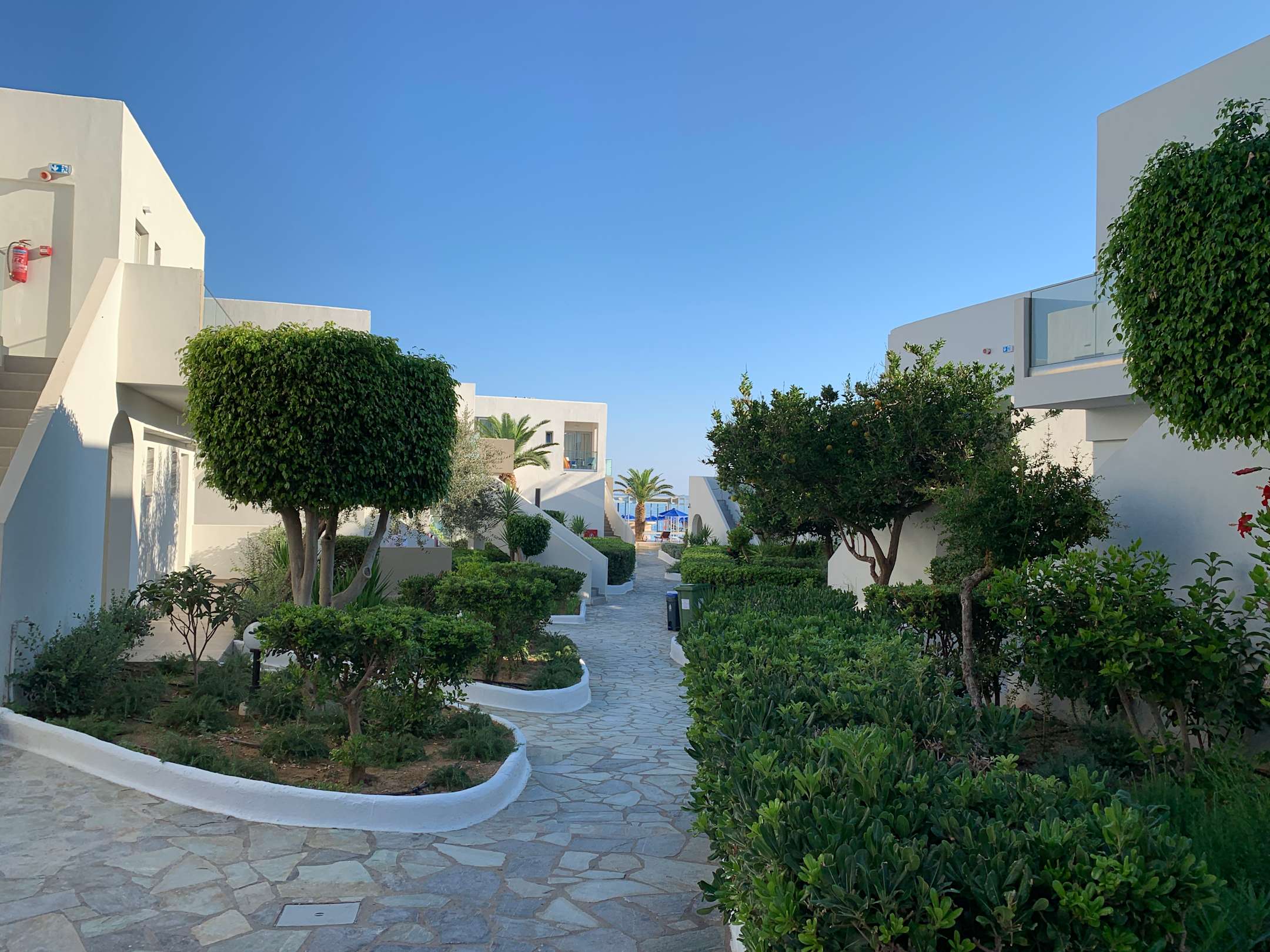 Blick durch die Hotelanlage in Richtung Pool / Meer