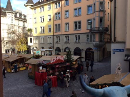 AußenansichtBlick vom Balkon. Da steht zur Zeit eine Kuh drauf, aber man hat genug Platz zum Hinsetzen.