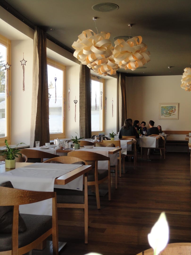 Hier sieht man das Restaurant, in dem gerade Frühstück gegessen wird, sehr ruhig gelegen mit SUPER Ausblick auf die Berge.....Das Restaurant erst neu möbliert , sehr modern und einladend....