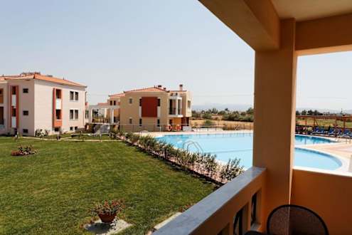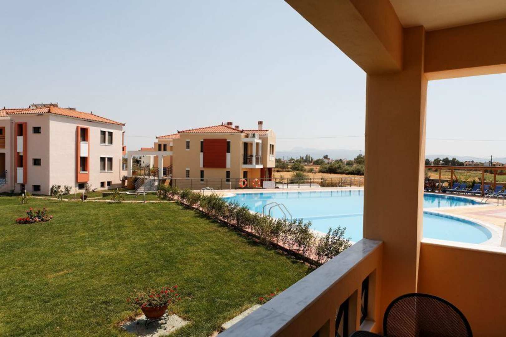 Blick vom Balkon des Zimmers 111 auf den Pool und die Nebengebäude.