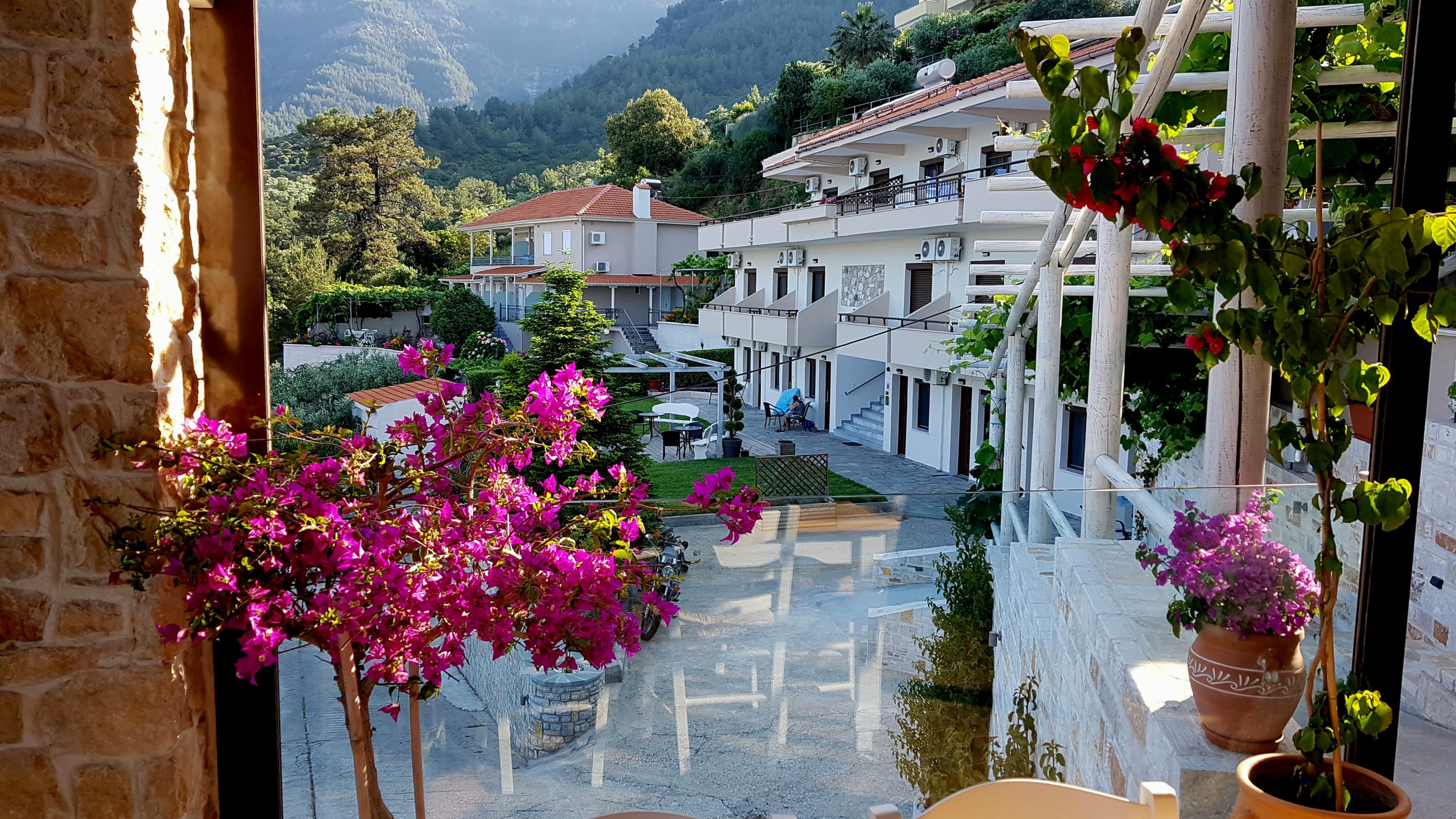 Blick von der Taverne zum Appartmenthaus
