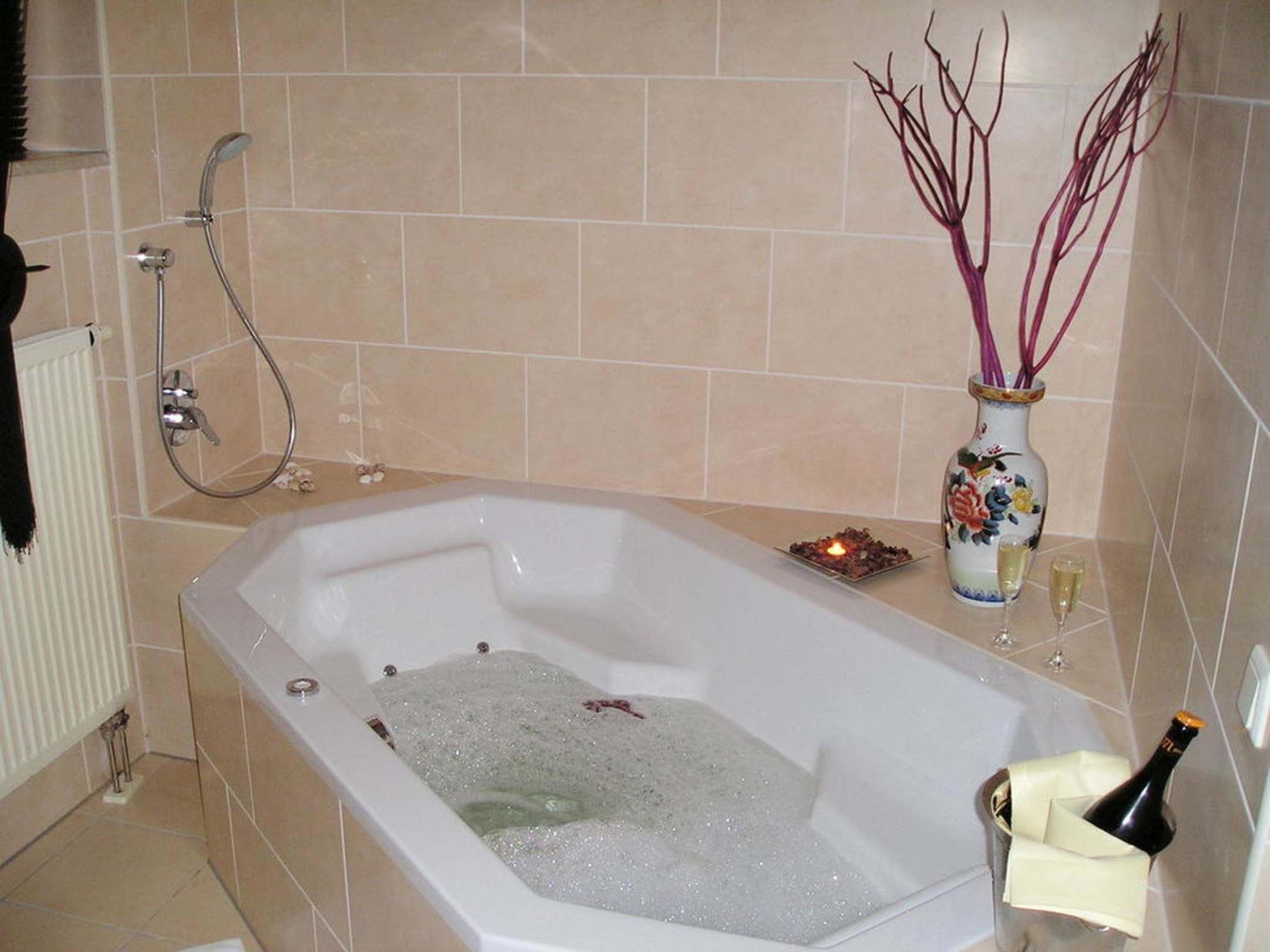 Rosenblütenbad mit Prosecco bei Kerzenlicht