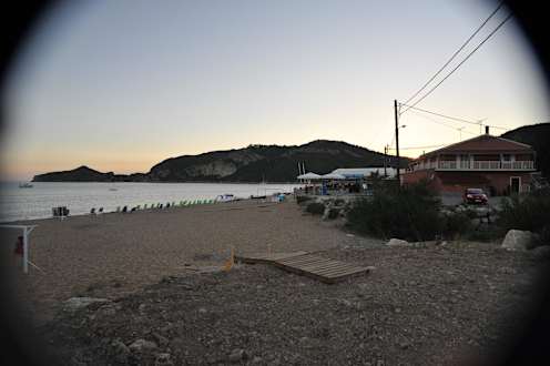 Strand mit RestaurantStrand in der Nebensaison, rechts im Bild eines von mehreren Restaurants direkt am Strand.