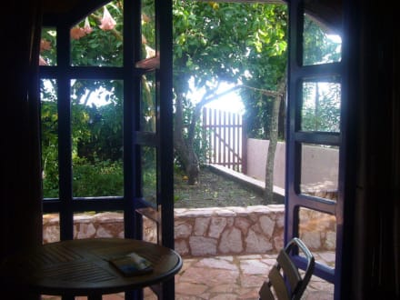 Blick aus dem Wohn-/ Schlafraum der Ferienwohnung Alamanos I. Kleine Terrasse für beide Wohnungen, ausreichend für eine Frühstücksecke. Kleiner Garten mit Zitronenbäumen.