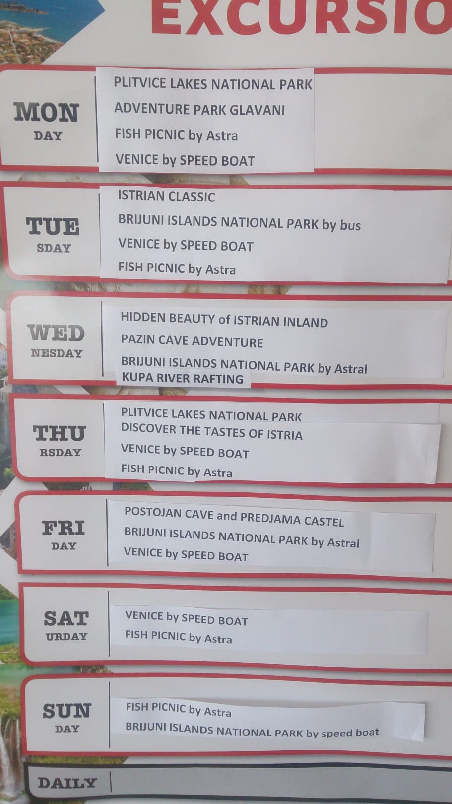 Mögliche Ausflugziele und Angebote im Hotel und auf dem Gelände der Hotelkette.