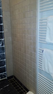 Rechts die offene große Dusche mit Wandheizkörper