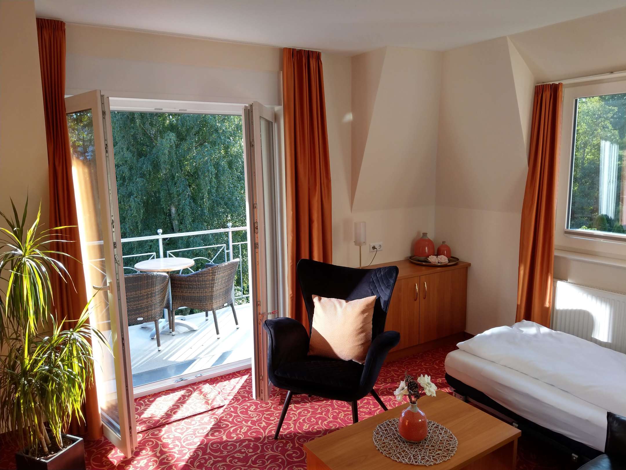 Wohnzimmer der Suite Emilie mit Blick auf den Balkon