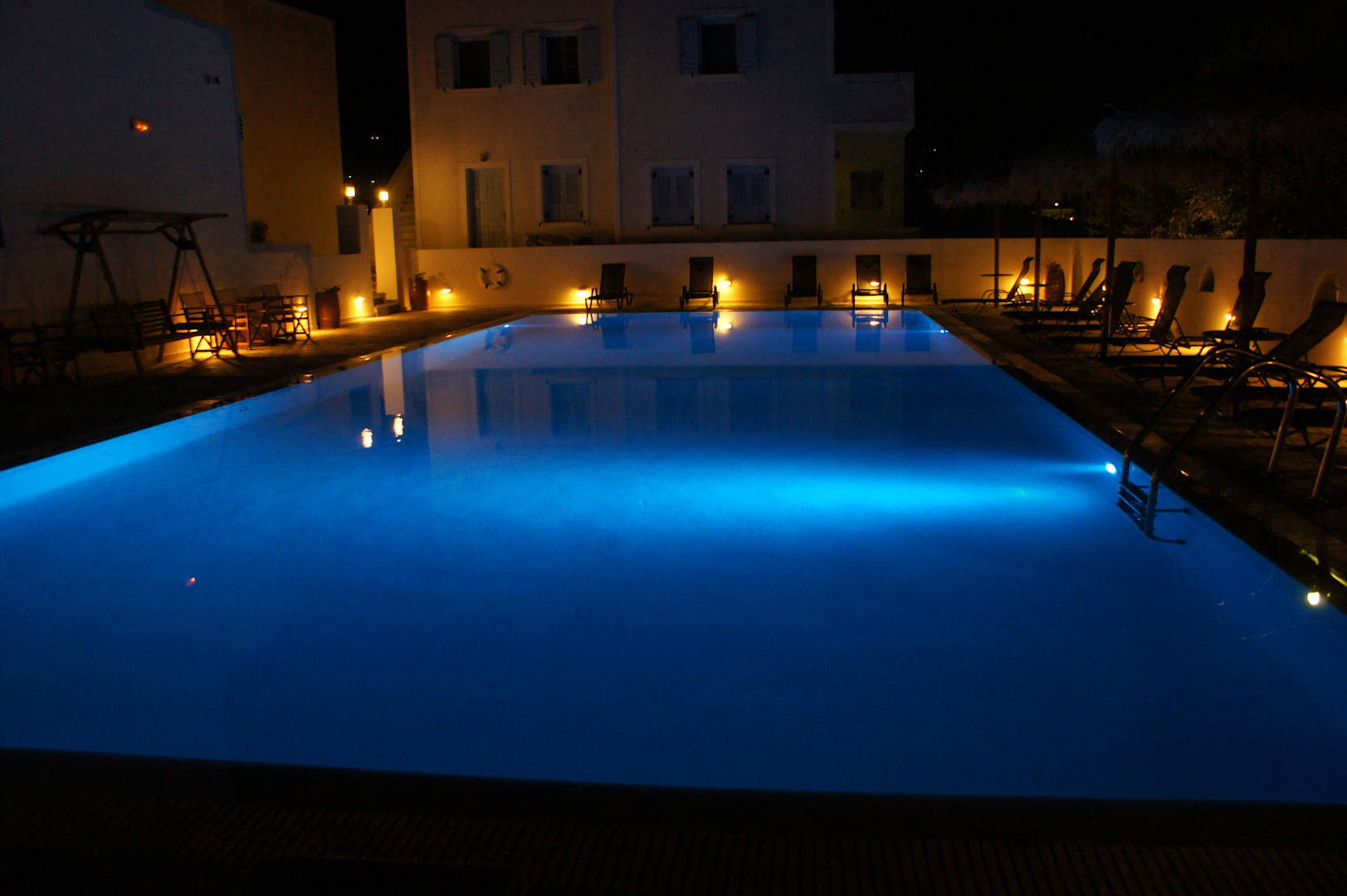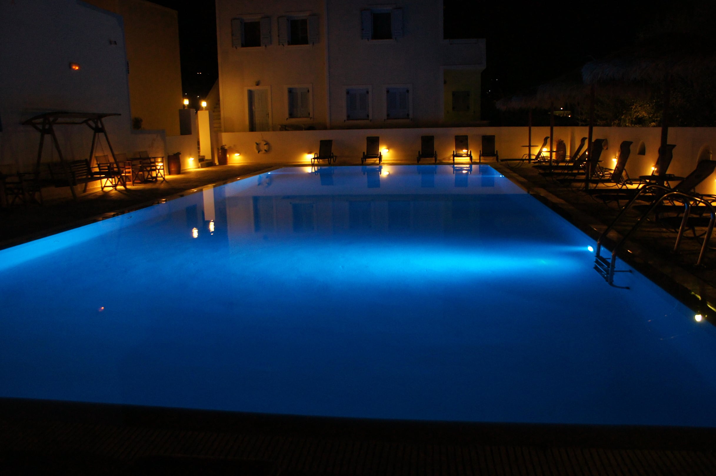 Pool am Abend mit verschiedenen Farben beleuchtend