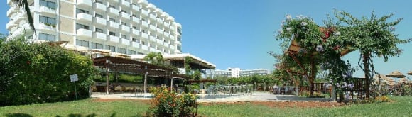 Eine Panorama-Aufnahme des Pools des Hotel Alion Beach aus dem Garten gesehen