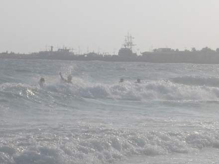 Grosse WellenHohe Wellen und Leute, welche sich noch in diesen vergnügen am Strand von Ayia Napa mit Sicht auf den Hafen