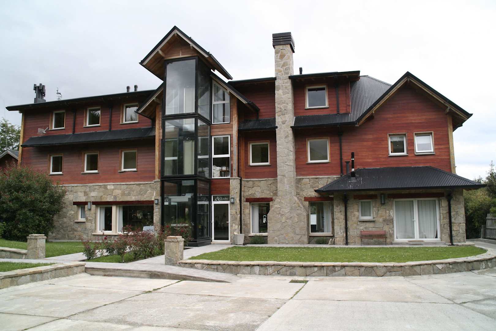 Rückansicht Hotel Alma Andina (vom Parkplatz)Deutlich sichtbar ist der von der Außenseite in Glasbauweise erstellte Aufzug.
