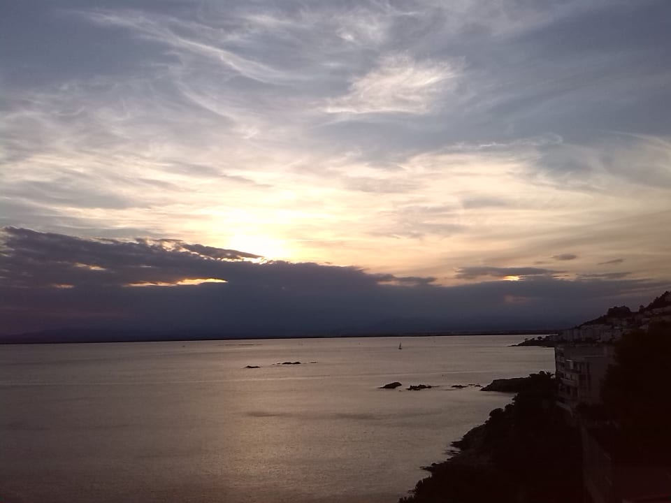 Blick vom Balkon auf der Westseite auf die Bucht, abends.