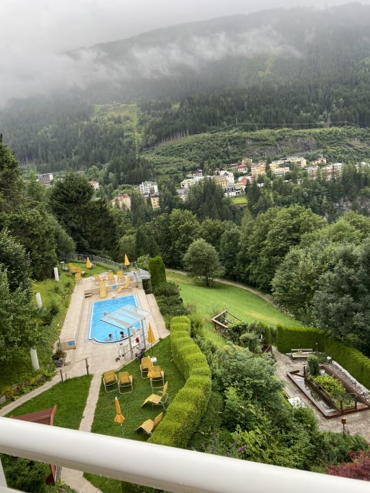 Ausblich vom Balkon in den Garten mit Pool