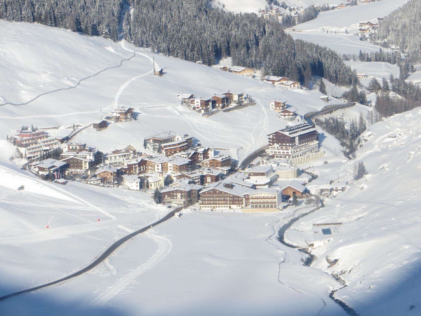 Blick von der Gondel auf Hintertux, Hotel Alpenhof oben rechts