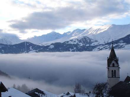 In Fendels wohnt man über den WolkenDurchs Oberinntal ziehen dichte Wolken, Blick vom Balkon in Richtung Serfaus/Fiss
