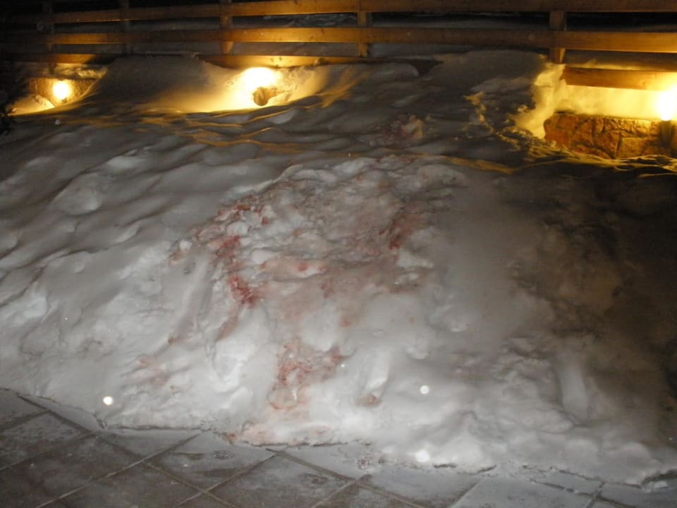 Bloed of rode wijn op de sneeuw vlak aan de ingang van het hotel