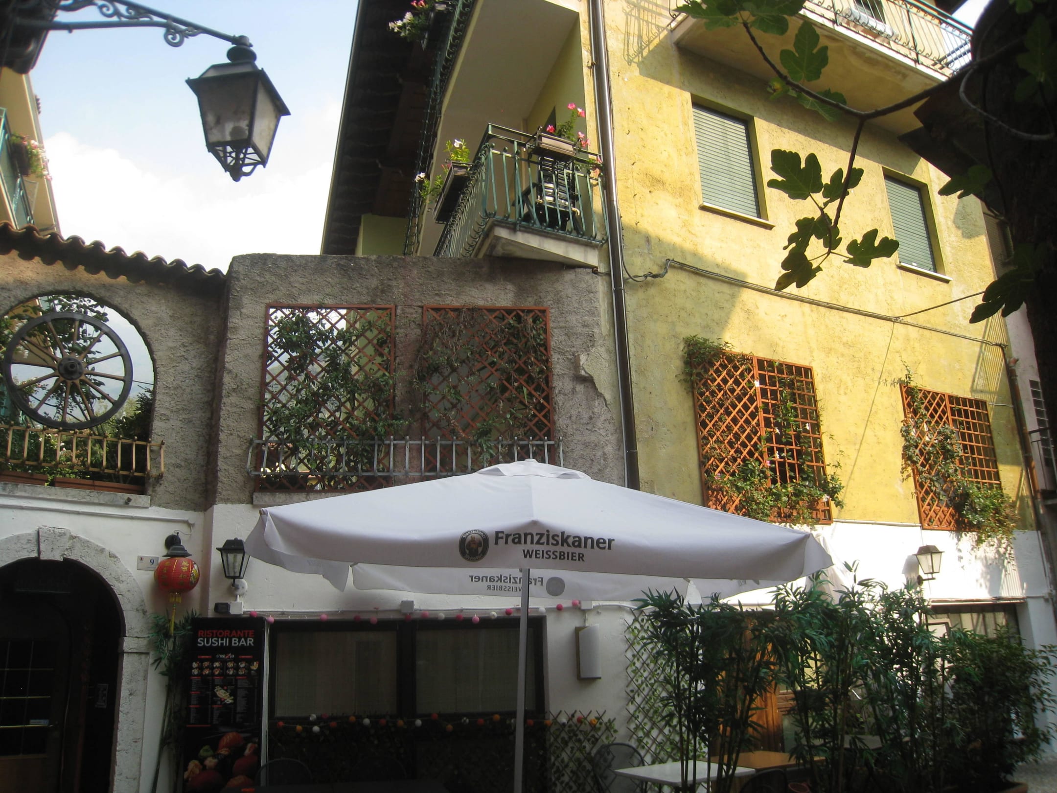 Blick vom Hof auf den Zimmerbalkon