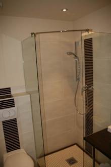 Sieht chic aus, aber unpraktisch beim Duschen, da die Duschkabine offen ist.