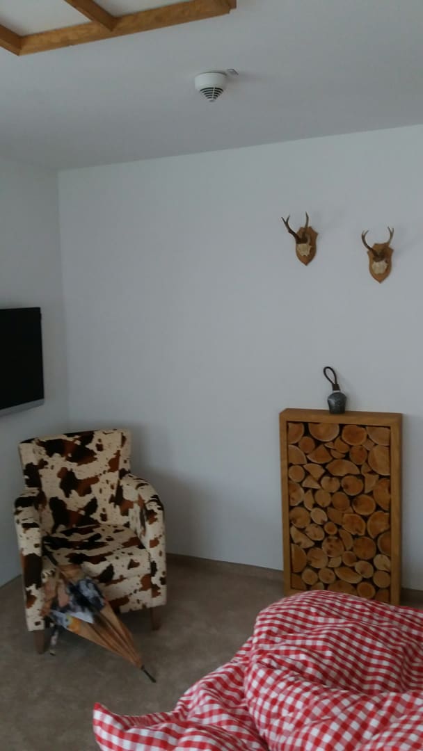 Unser "Pfänder"- Zimmer - urig eingerichtet mit dem "Holzstapel", den Geweihen, der karierten Bettwäsche & dem "Alm- Wecker" - einer kleinen Kuhglocke