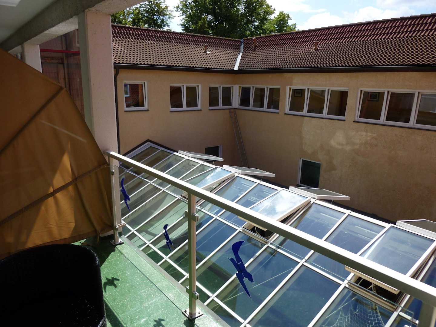 Blick auf den Innenhof, unten Rezeption und Bar