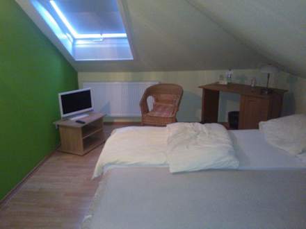 Doppelbett, Fernseher, Schreibtisch, Sessel