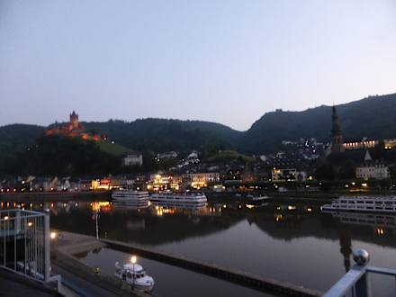 Blick vom Balkon auf das nächtliche Cochem und die Mosel.