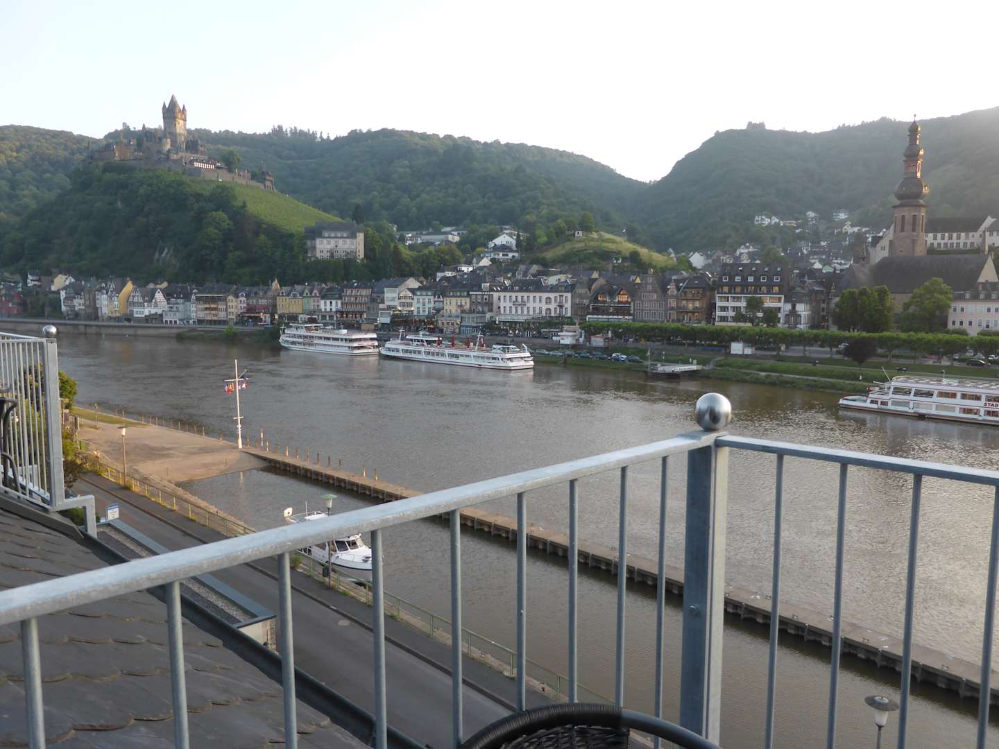 Blick vom Balkon auf die schöne Stadt Cochem und die Reichsburg.