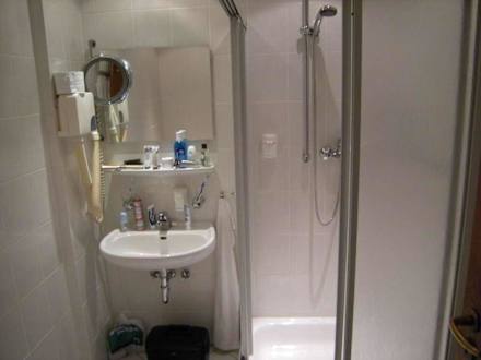 relativ kleines Duschbad mit allen erforderlichen Ausstattungsdetails. Wenig Ablagen.