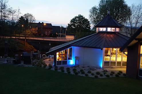 Das illuminierte Restaurant am Abend vom Balkon