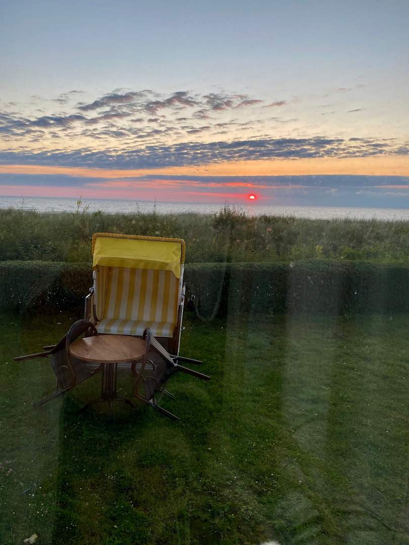 Vom Hotelzimmer auf dazugehörigen Gartengrundstück mit Blick auf das Meer Uhrzeit 5.00 am Morgen
