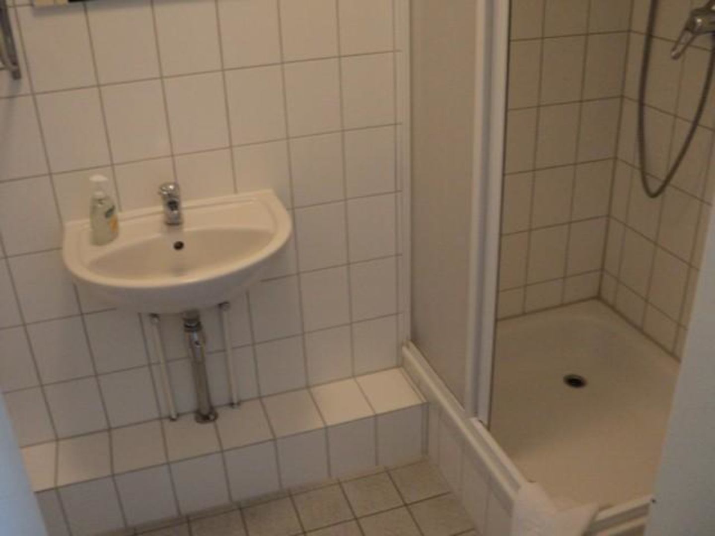 Alles Wichtige im weißgefliesten Bad, das ist ok.