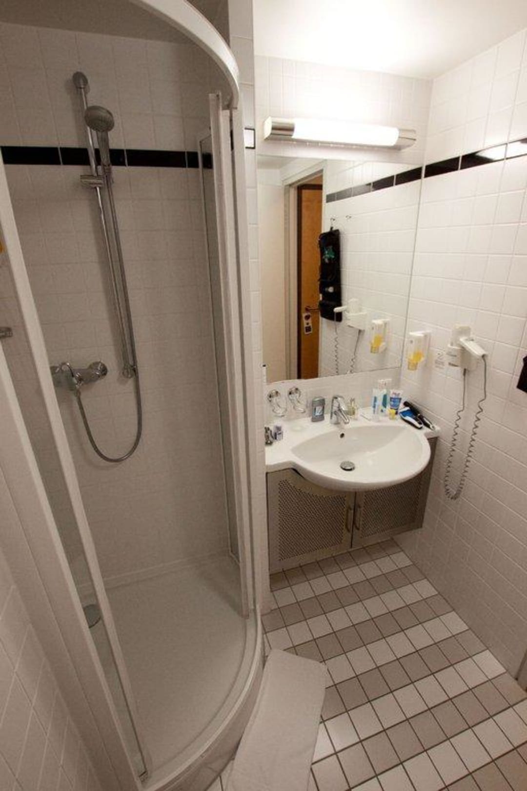 links die Duschkabine - rechts das Waschbecken samt Fön