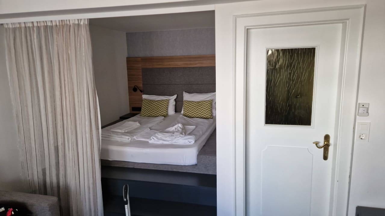 ZimmerBett nur über zwei Stufen erreichbar,stolpergefahr besonders Nachts.Vorhänge verschmutzt und in die Jahre gekommen.