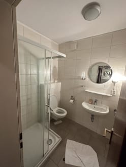 ZimmerBad mal erneuert, aber offensichtlich lieblos über die alten Fliesen. Lampen defekt. Heizkörper von 1900 ohne neuen Anstrich.