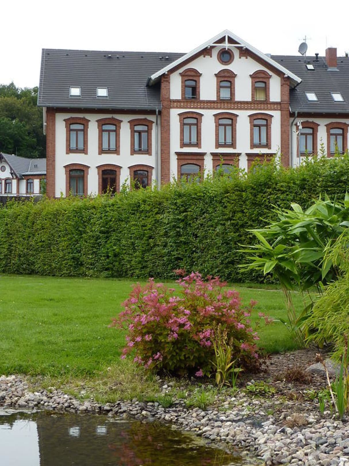 Blick vom Garten auf die Rückseite des Hotels