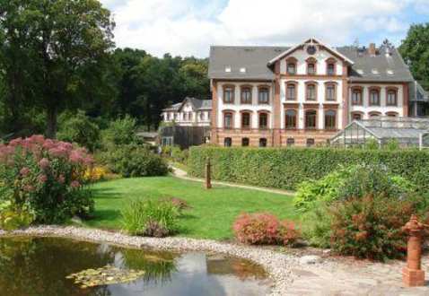 Blick vom Garten auf das Hotel