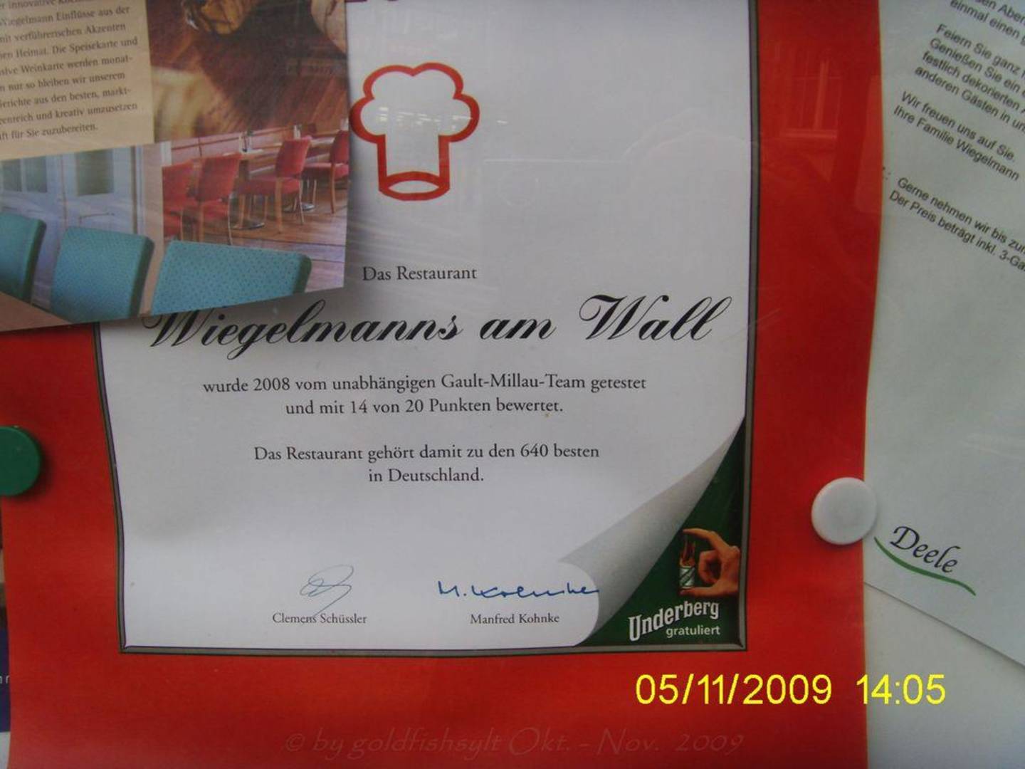 Aushang über eine Auszeichnung aus 2008 für das Restaurant des Hauses!