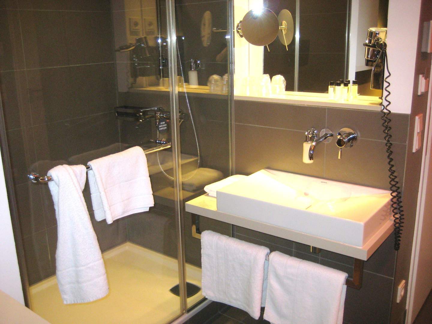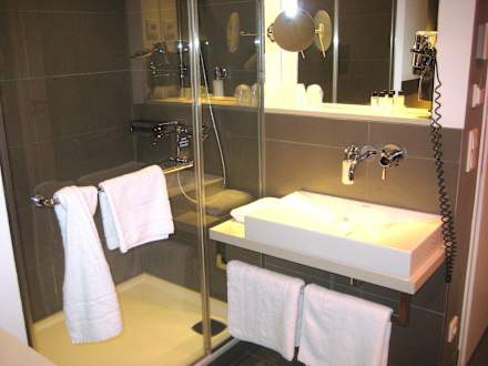 Duschkabine und WaschtischLinks die Duschkabine mit Glastür, rechts der Waschtisch mit Spiegel, Vergrößerungsspiegel und Fön.