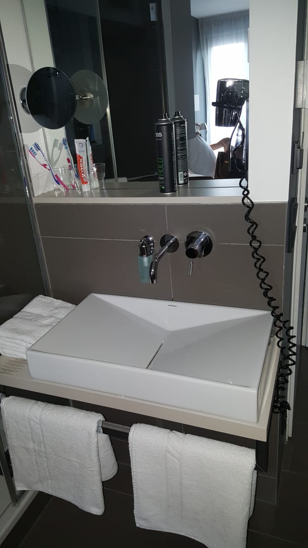 Standard Zimmer. Waschbecken mit Spiegel und Föhn