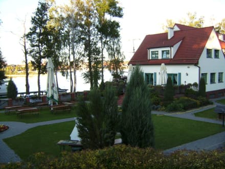 Blick durch den Garten zu Hotel und See