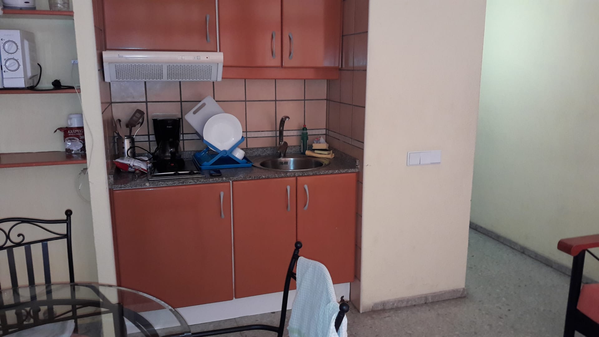 ZimmerEine ausreichende Küchenzeile, mit Besteck und Kochtöpfen, Mikrowelle und auch eine Kaffeemaschine waren vorhanden.