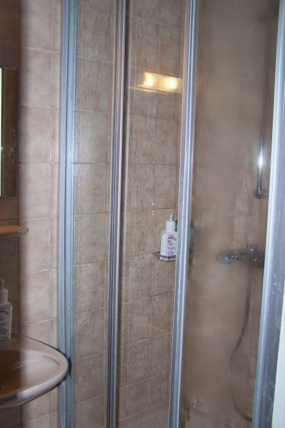 Dusche nicht besonders hygienischBeginnender Schimmel, eingerissene Kacheln und schmutzige Duschwand sprechen für fehlende Hygiene!