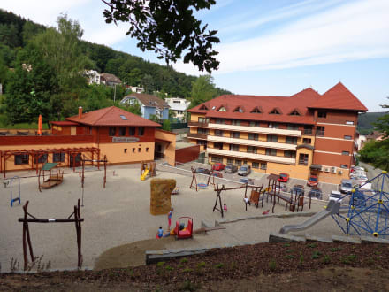 pohled na hotel s dětským hřištěm od lesa