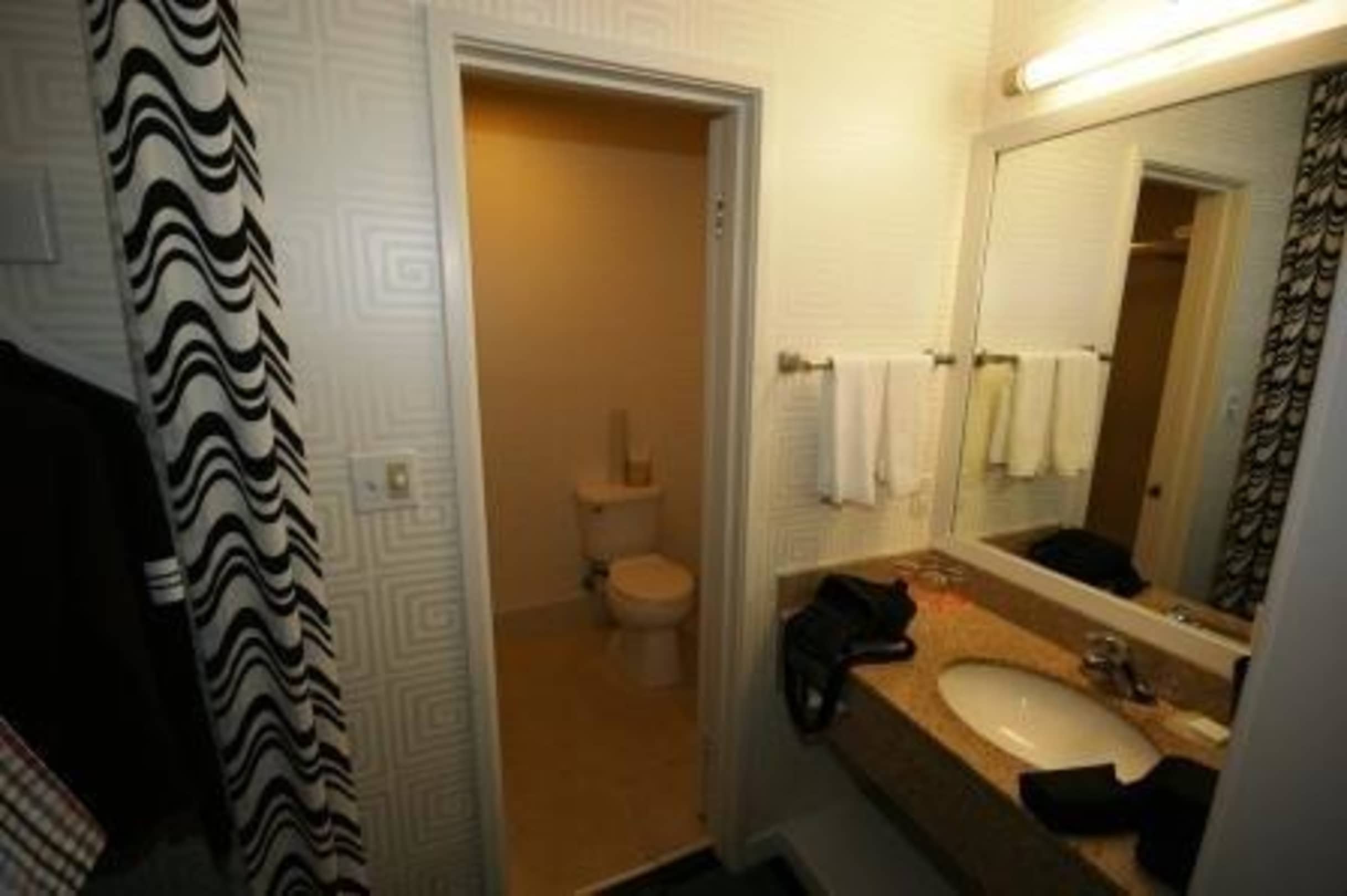 Die Naßzelle ist in den USA Hotels meist geteilt. In einem verschlossenen Teil befindet sich die Toilette und Dusche (..bzw. Badewanne) und in einem offenen (..meist abgetrennten) Bereich die Waschbecken.
