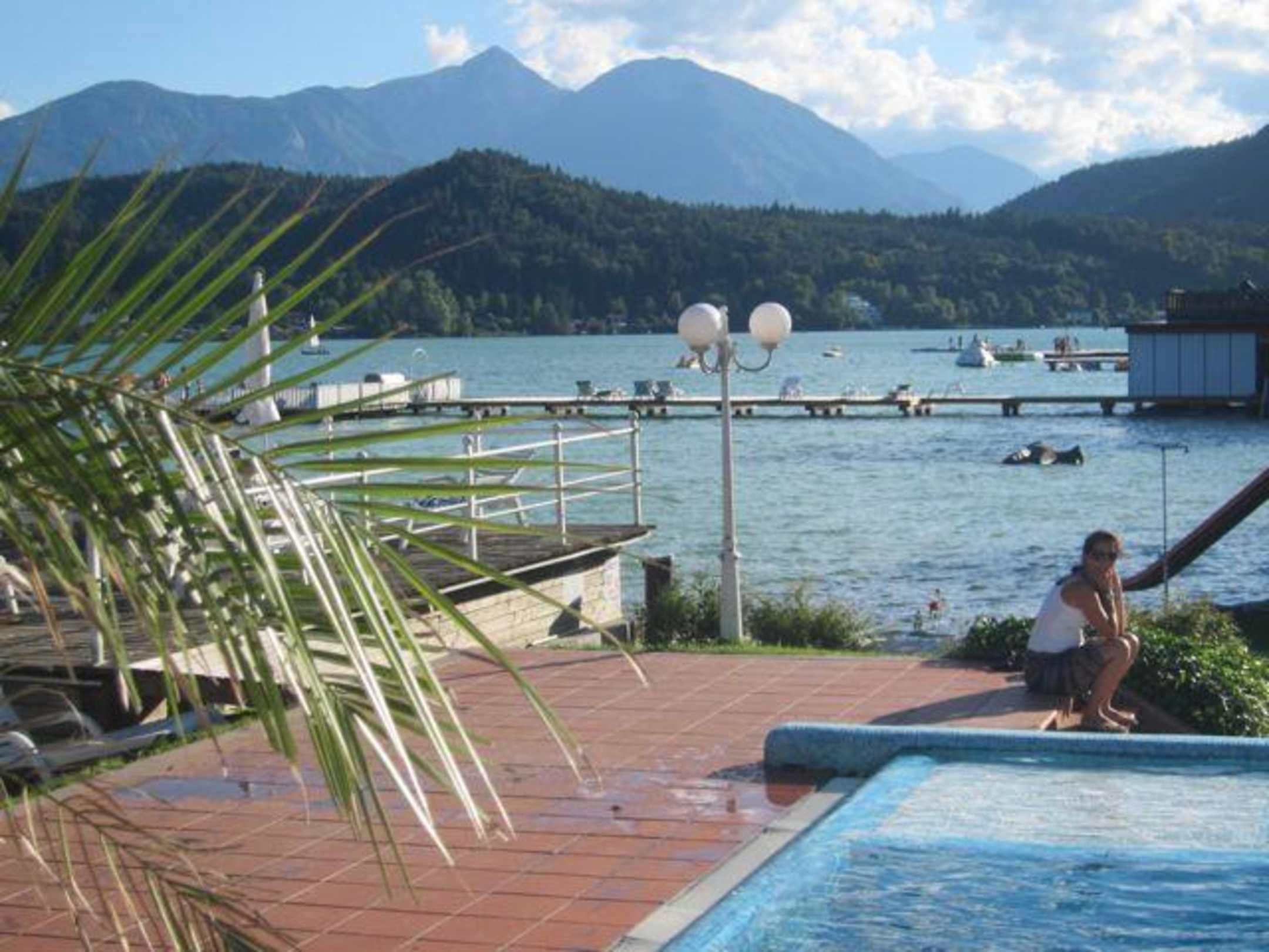 Pool, See und Bergeblick vom pool auf den strand und im hintergrund der höchste berg der region, der hochobir der einen ausflug unbedingt wert ist