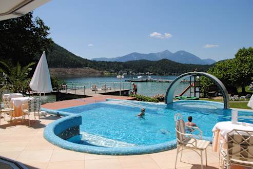 Blick auf Pool & See vom Seeclub (Café)